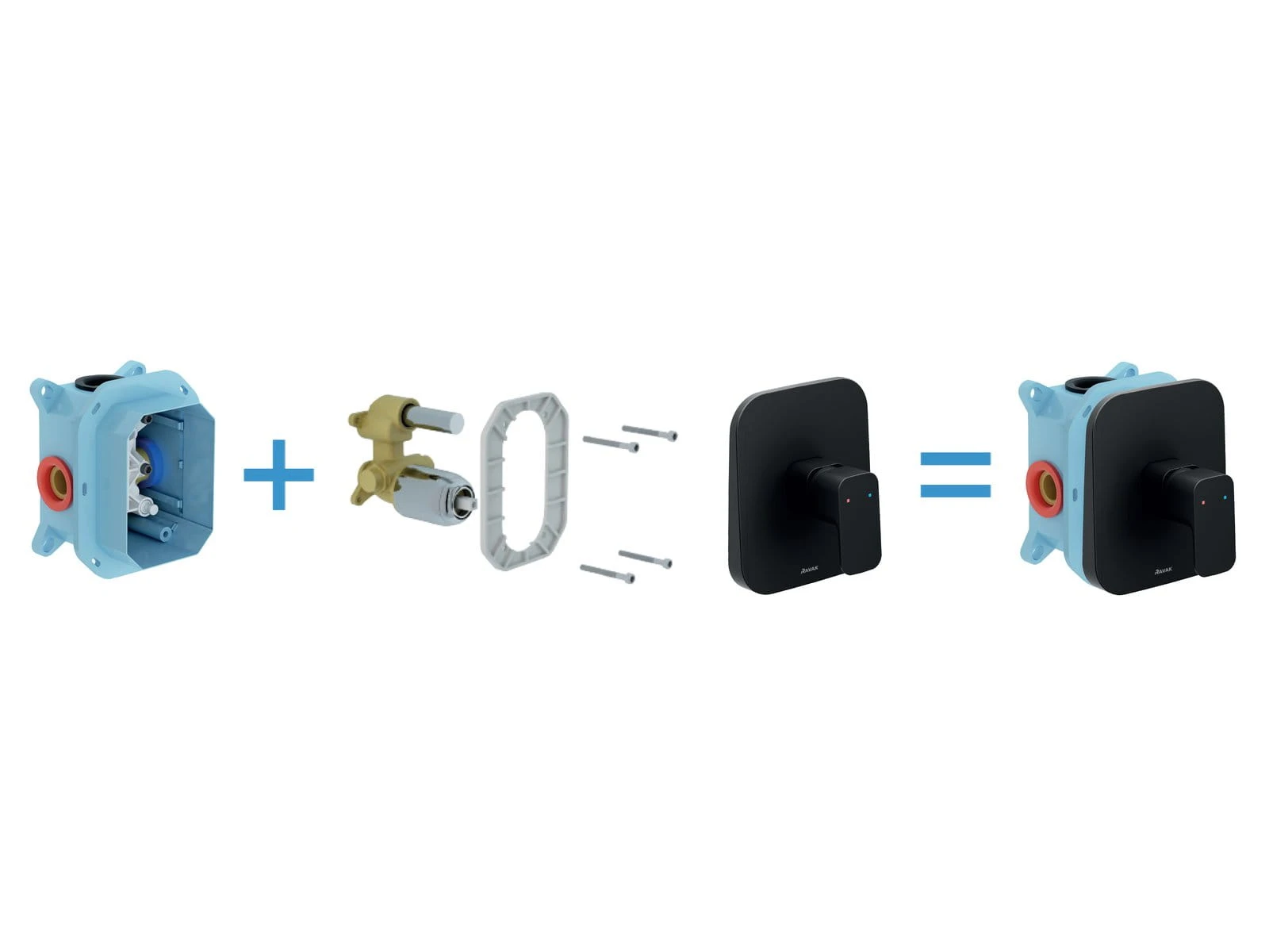Uniwersalny system R-box zabudowany w kasecie z tworzywa sztucznego chroni wewnętrzne elementy baterii zainstalowane w ścianie, umożliwiając lepsze przygotowanie pionowych płaszczyzn i ułatwiając pracę glazurnikom. System pozwala na instalację zewnętrznych elementów baterii już po zakończeniu prac budowlanych, unikając w ten sposób porysowania i uszkodzenia baterii. R-box upraszcza i przyspiesza osadzenie baterii podtynkowej, jednocześnie gwarantując precyzyjną i czystą instalację. Opakowanie R-box zawiera materiał do mocowania w ścianie, nie zawiera materiałów do podłączenia doprowadzenia wody. Po usunięciu górnej osłony R-box system utrzymuje dopływ wody w łazience, dzięki czemu możliwe jest sprawdzenie szczelności systemu.