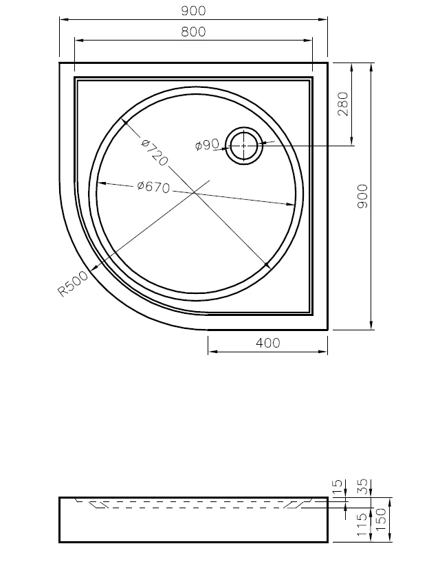 Brodzik przeznaczony do kabin prysznicowych półokrągłych o wymiarach 90x90 cm, kompatybilny m.in. z kabinami Ravak serii SKCP4, BLCP4, BLSCP4, PSKK3, NSKK3