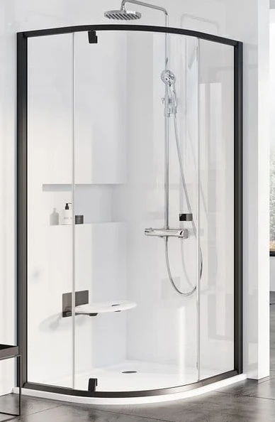 Kabina prysznicowa RAVAK półokrągła 90 x 90 cm, otwierana, czarny mat/ szkło przezroczyste