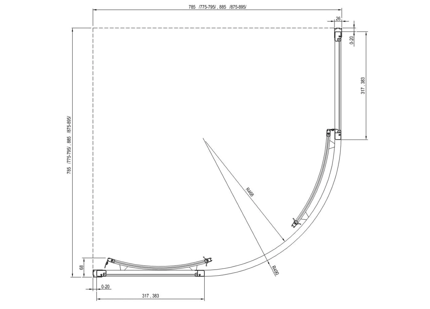 Produkt składa się z dwóch stałych prostych i dwóch giętych elementów tworzących drzwi przesuwne. Montaż w obłożonym płytkami rogu łazienki na brodziku Ravak: Ronda, Ronda Basic, Elipso, Elipso Pro, Elipso Pro Chrome lub bezpośrednio na podłodze z wbudowanym odpływem liniowym lub kratką odpływową.