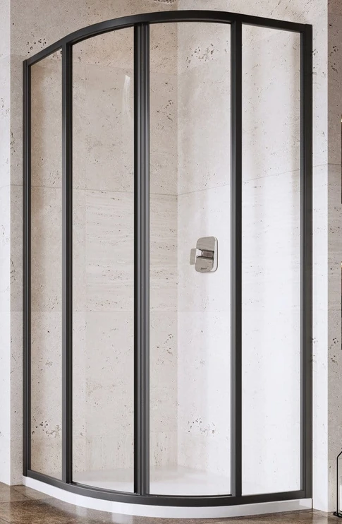 Czteroczęściowa półokrągła kabina prysznicowa Supernova w czarnym wykonaniu z wypełnieniem z przezroczystego szkła z warstwą ochronną Ravak AntiCalc®. System otwierania przesuwny.