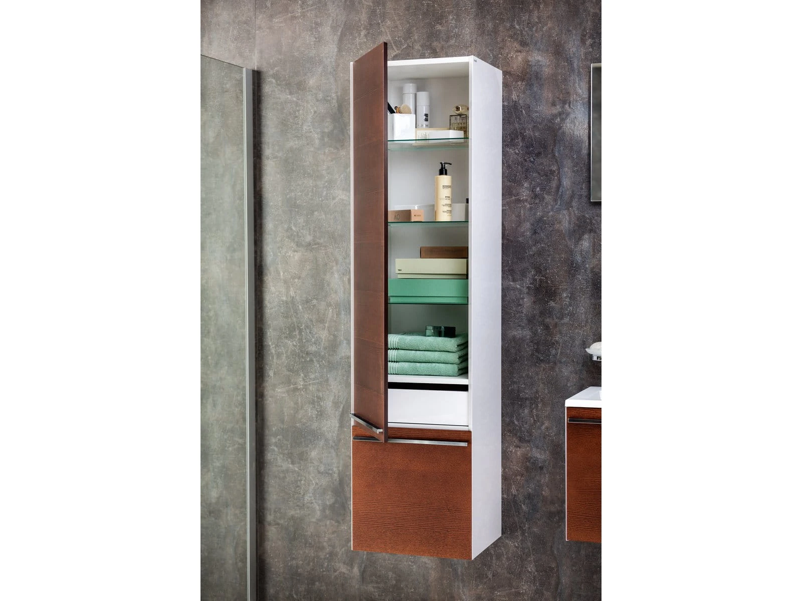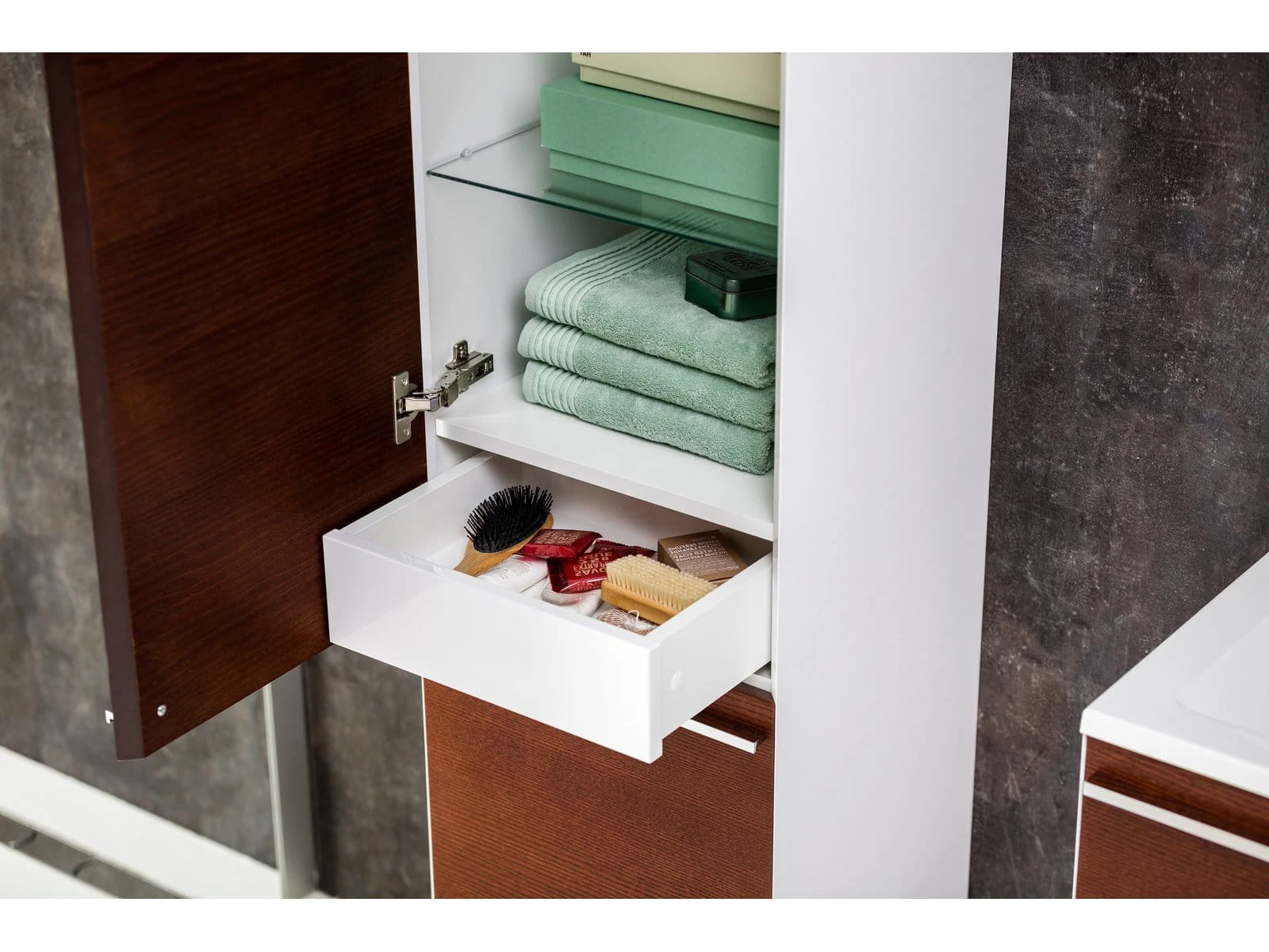 Wysoka szafka SB-400 L CLEAR jest wyposażona w wysokiej jakości zawiasy z amortyzatorem zamykania. Dwoje drzwi i wewnętrzna szuflada oferują przestronną przestrzeń do przechowywania przedmiotów różnej wielkości. Wewnątrz szafki znajduje się trzy szklane półki. Wewnętrzny korpus szafki jest w praktycznym szarym kolorze.