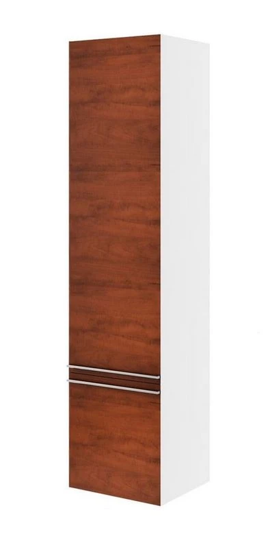 Szafka słupek boczny z praktycznymi półeczkami zapewnia obszerną przestrzeń do przechowywania. Fornir czereśnia o naturalnym rysunku i designie w stylu drewnianych desek wprowadza naturę do wnętrza łazienki. Korpus słupka w białym wykonaniu.