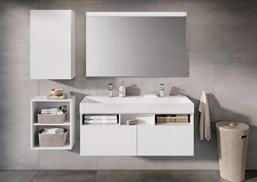 Kompaktowa i efektowna szafka do powieszenia na ścianie. Możliwość łączenia z zamkniętym wariantem i szafką podumywalkową. Wykończenie z zewnątrz i wewnątrz w lakierowanej bieli dodaje szafce nowoczesnego wyglądu.