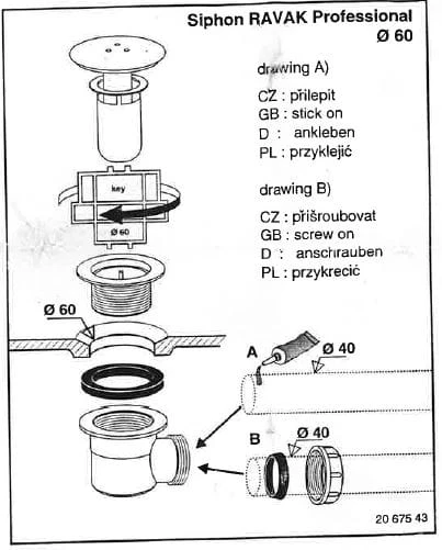 Syfon brodzikowy Professional 60 jest odpowiedni do wszystkich typów brodzików prysznicowych (Ø 60 mm), z wyjątkiem głębokich brodzików siedzących Sabina. Zalecamy szczególnie do brodzików Galaxy Pro (Flat). Do syfonu można dokupić redukcję, która redukuje różnice wymiarowe między syfonami Ravak (średnica 40 mm) a rurami odpływowymi (średnica 50 mm).
