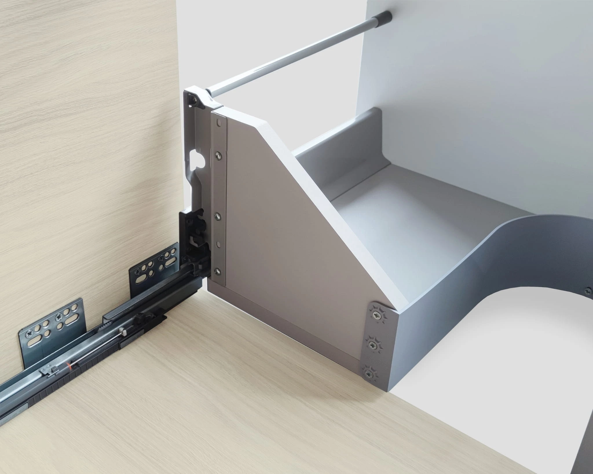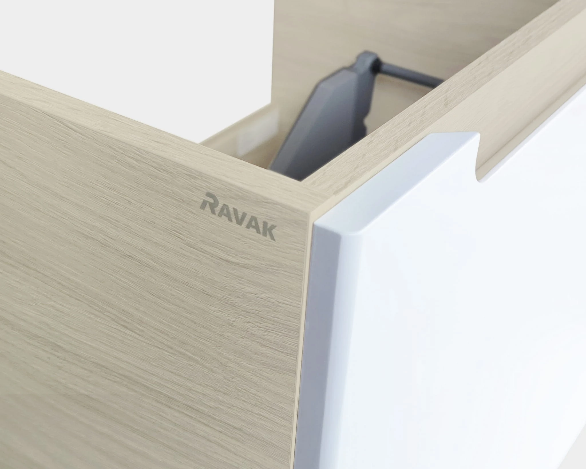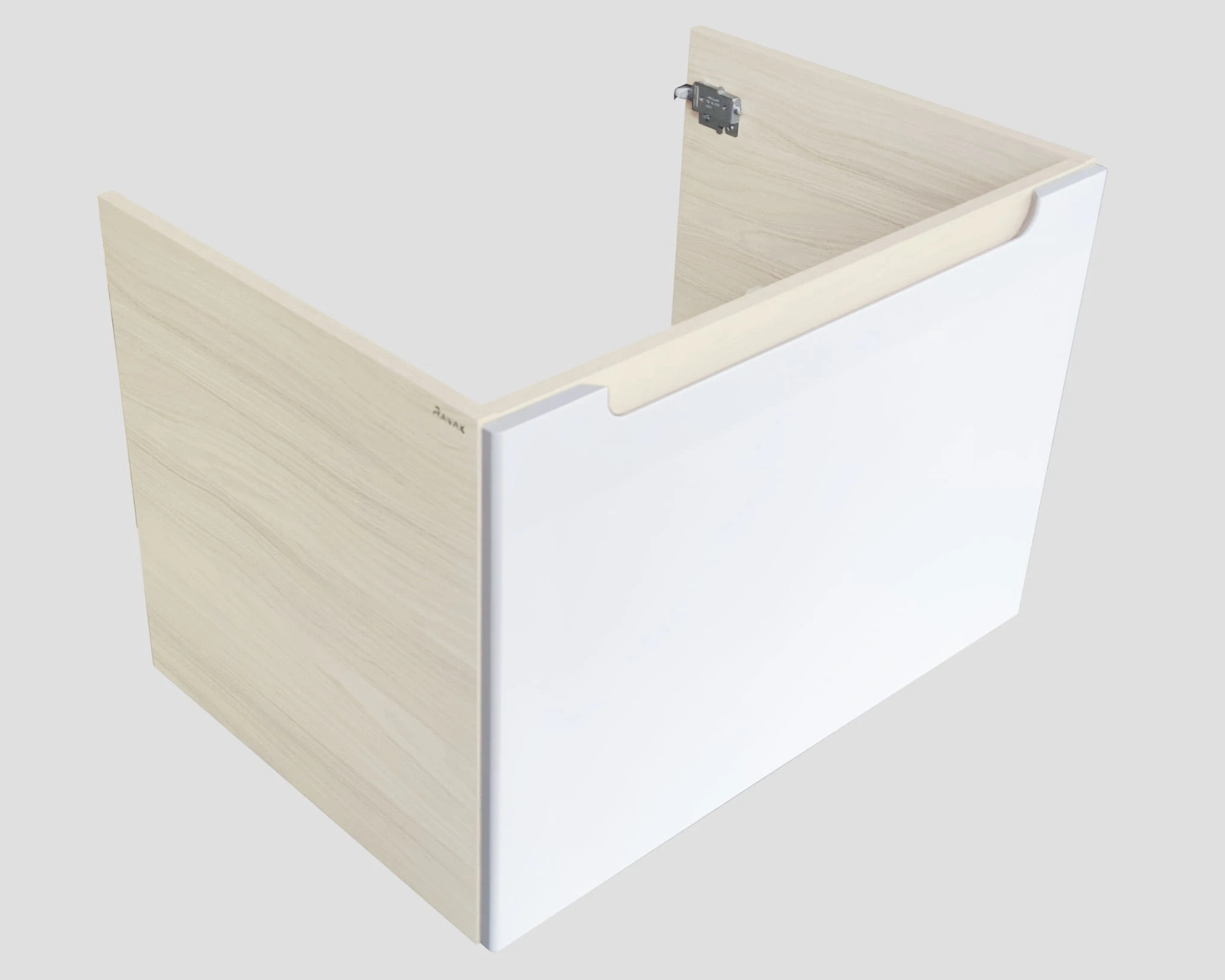 Design szafki podkreśla ergonomiczny uchwyt płynnie zintegrowany z nieskazitelnie białymi, lakierowanymi frontami. To nie tylko dodaje odrobiny wyrafinowania, ale także harmonizuje z paletą kolorów mebli, podkreślając subtelną grę między bielą i odcieniami brzoza.