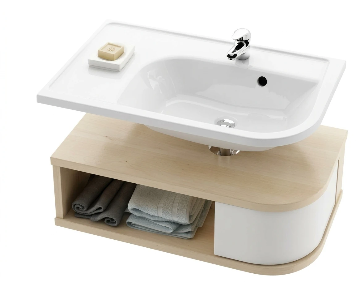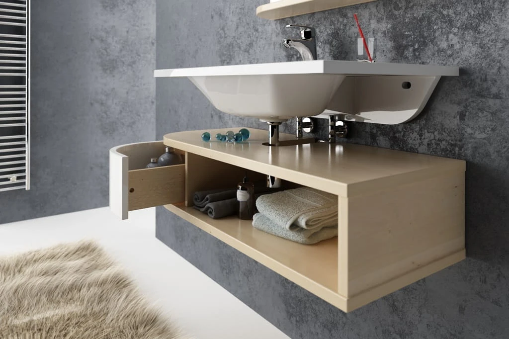 Otwarte półki nadające szafce lekkości będą idealnym rozwiązaniem do małych łazienek, również hotelowych.
