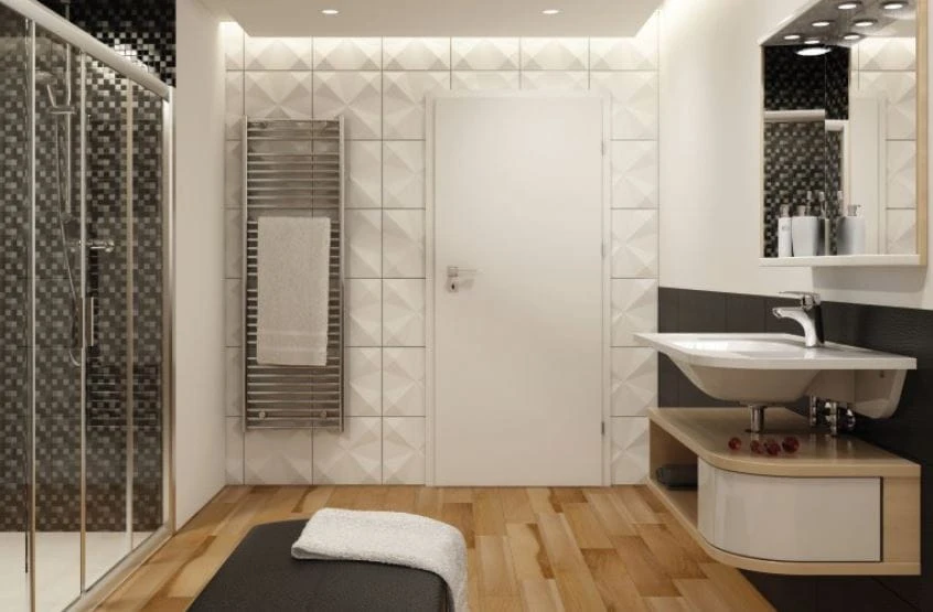 Meble możemy umieścić w rogu łazienki, przy krawędzi wanny z parawanem lub obok ścianki kabiny prysznicowej.