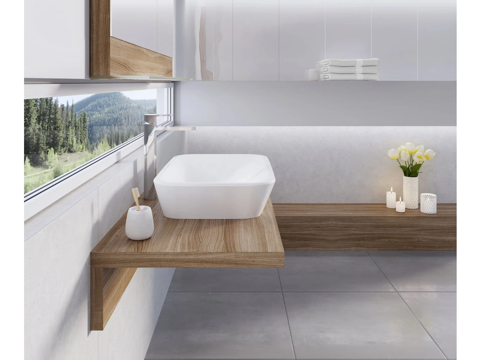 Te umywalki są przeznaczone do umieszczenia na blacie. Minimalistyczny design pięknie prezentuje się na drewnianym blacie i dodaje wystarczająco dużo miejsca do przechowywania. Idealne są blaty z oferty RAVAK, które mają specjalne wykończenie dla długiej żywotności.