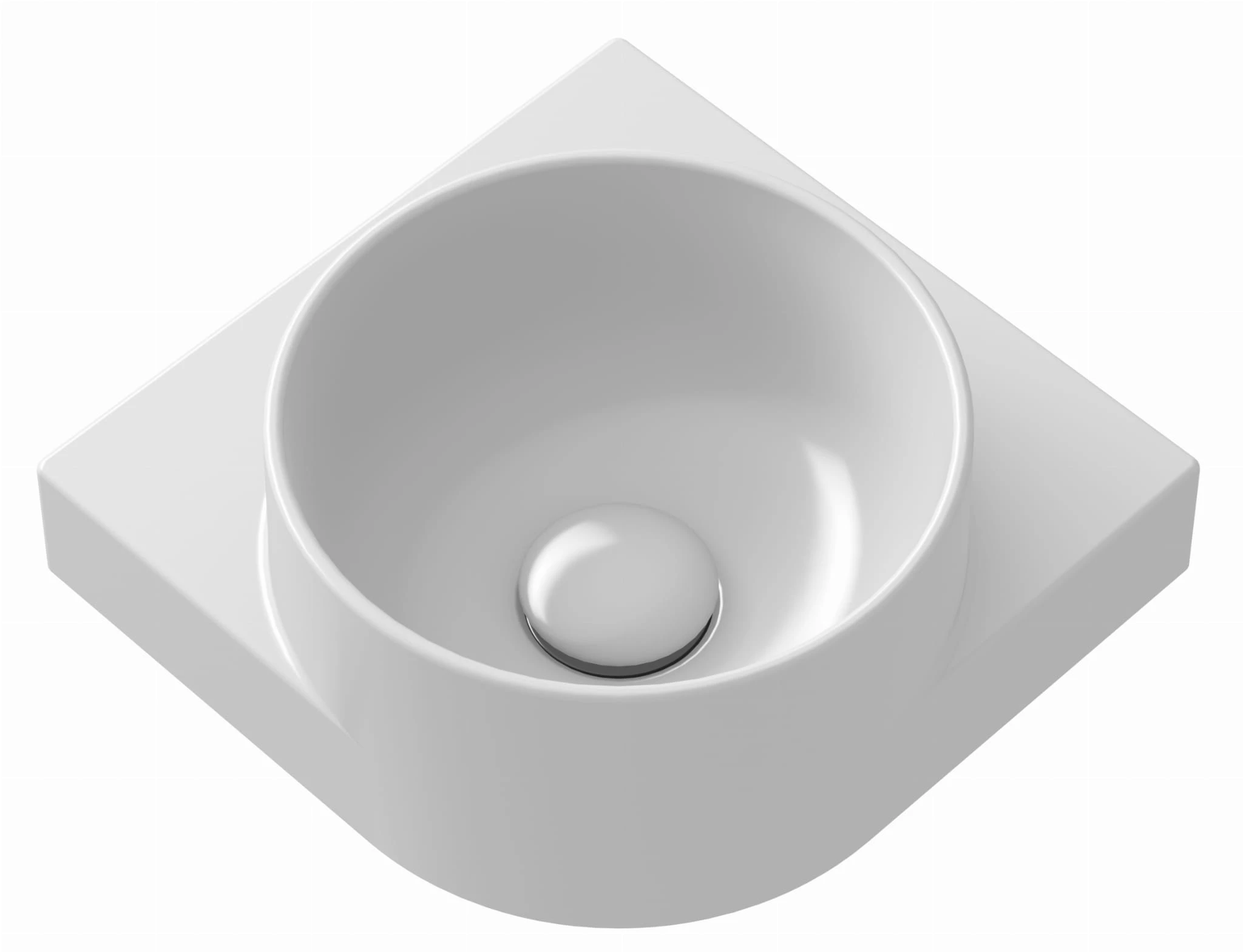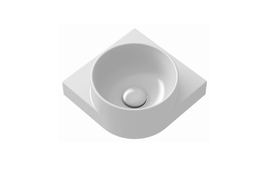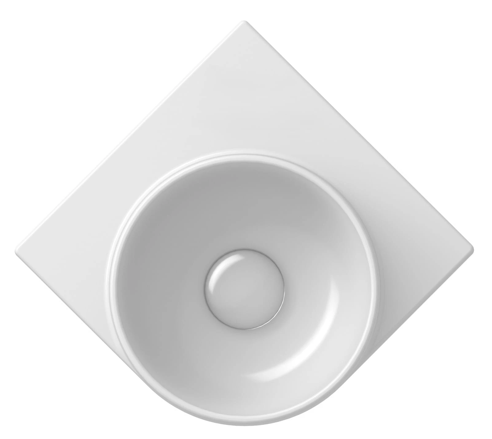 Narożna umywalka ceramiczna cienkościenna Yard przeznaczona do montażu na konsoli Yard lub na blacie, bez przelewu. Kolor biały połysk. Bez otworu na baterię.