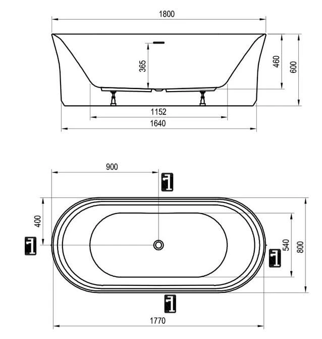 Wanna wolnostojąca YPSILON 180x80 akrylowa, biała z czarnym odpływem i przelewem [PRODUKT NOWY]