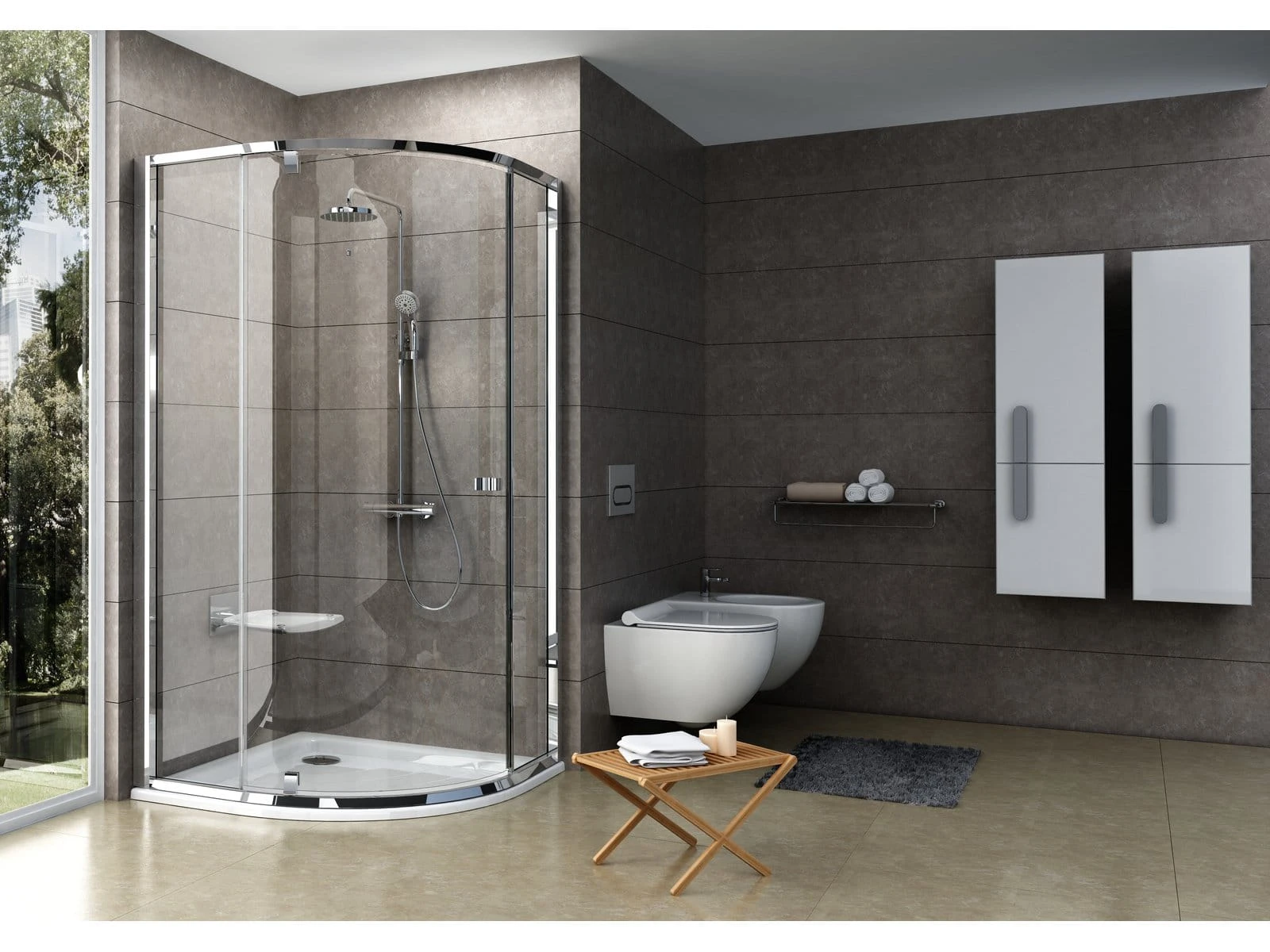 Trzyczęściowa półokrągła kabina prysznicowa Pivot w wykonaniu chrom błyszczący z wypełnieniem z przezroczystego szkła z ochronną warstwą Ravak AntiCalc®. System otwierania: obrotowy zawias. Produkt nie posiada wersji prawej i lewej.